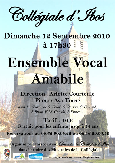 AMABILE est un ensemble vocal mixte qui travaille depuis 15 ans à Mazères-Lezons, sous la direction d'Arlette Courteille, accompagné au piano par Aya Torné.