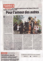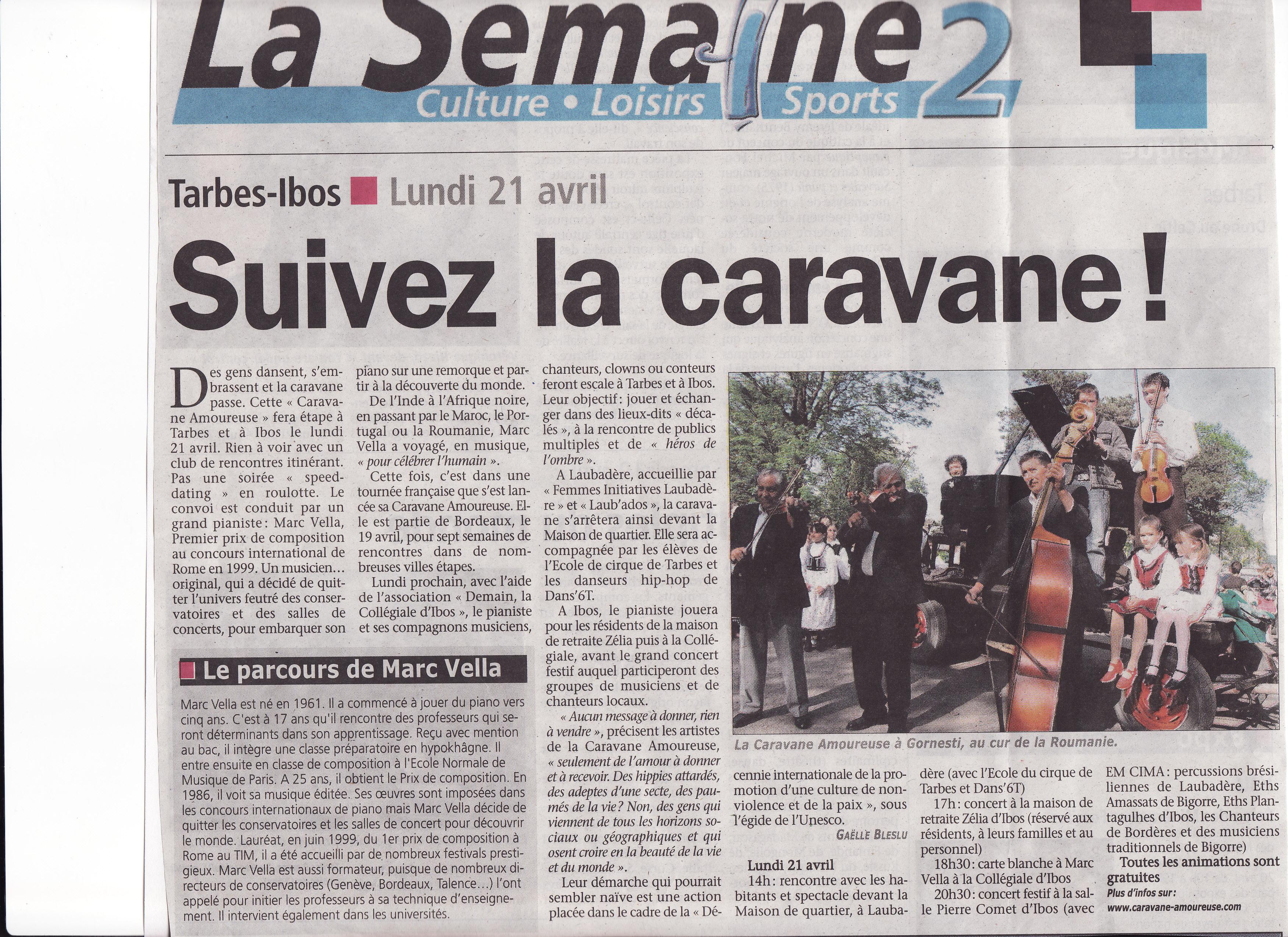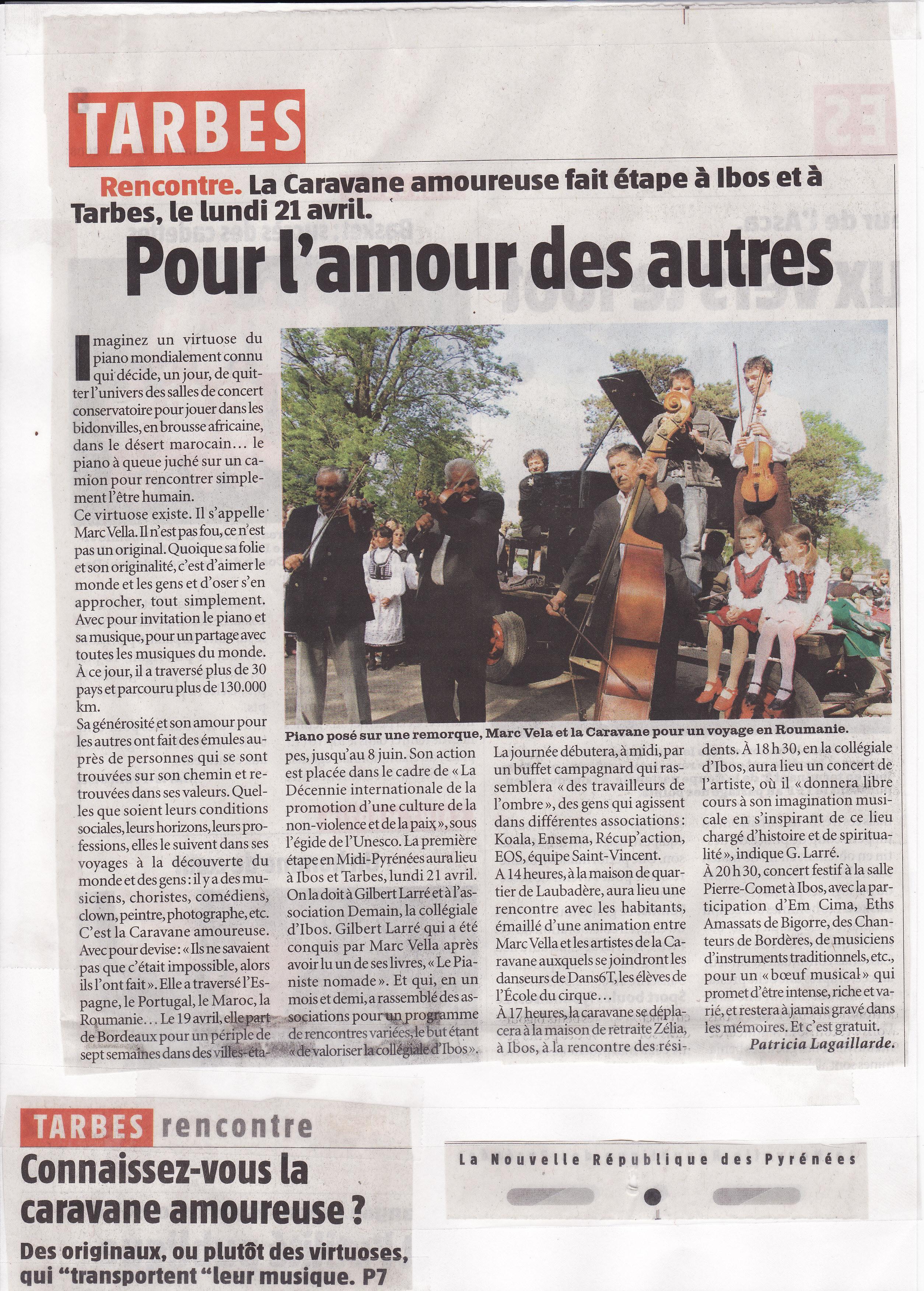 L’association Demain, la collégiale d’Ibos, organisatrice de l’étape bigourdane de la Caravane amoureuse, n’aurait pu mener à bien ce projet sans l’aide et le soutien de ses partenaires qu’elle tient sincèrement à remercier. Daniel Frossard, maire d’Ibos et toute l’équipe municipale pour leur soutien indéfectible dès le départ de l’aventure. La municipalité de Tarbes, Mme Delgado du Point Jeunes, les adolescents de Laub’ados, les enfants de meli-melo, 2 structures rattachées au FJT et qui participent à l’animation du quartier Nord, la CAF de Laubadère, les membres de Femmes Initiative Laubadère (FIL), le Club 21, l’Ecole du cirque. Un grand merci également aux artistes locaux qui ont accepté de se produire gratuitement Dans’6T, l’école de Samba EM-CIMA, Eths Amassats, Eths Plantagulhes, les musiciens de musique traditionnelle, les Chanteurs de Bordères.Enfin, un merci particulier à la presse locale qui a parfaitement relayé l’information.