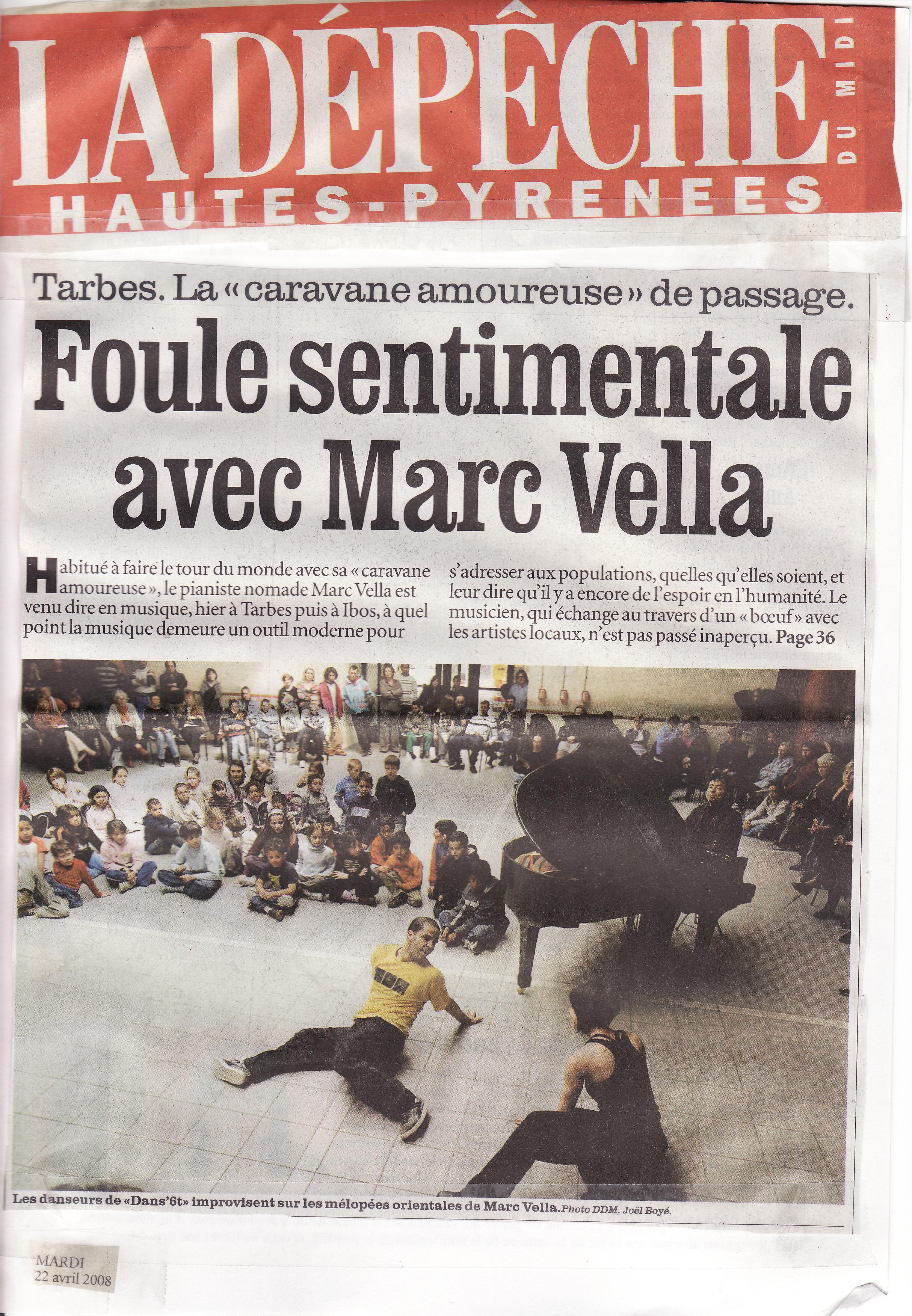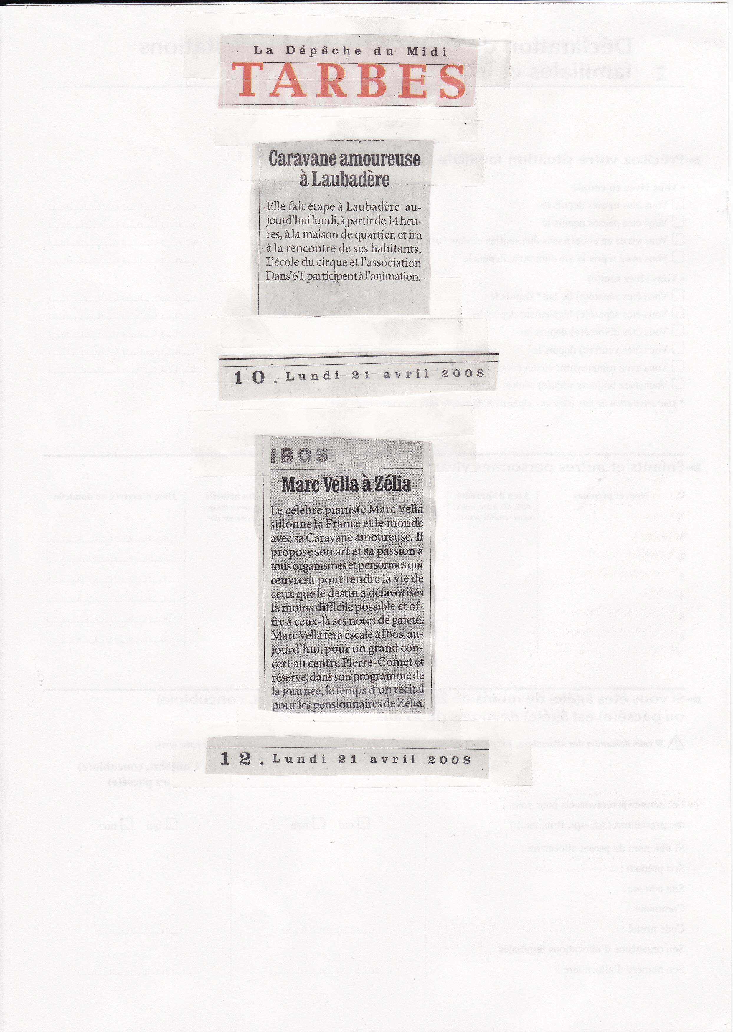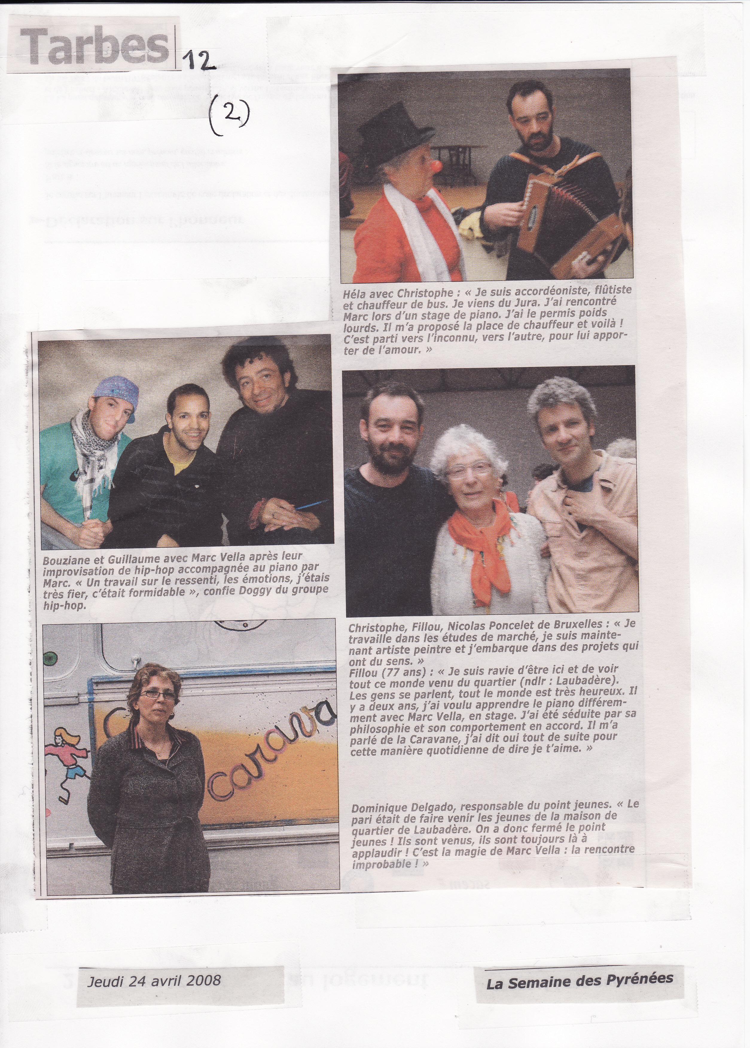 Une belle journée qui restera dans nos mémoires. L’étape d’Ibos-Tarbes de la caravane amoureuse s’est très bien passée. Malgré un temps exécrable, le public a quand même répondu présent et globalement l’événement fut une réussite. La rencontre des anciens à la maison de retraite a été un moment fort et nous avons trouvé notre récompense dans le regard des papis et mamies. Grand moment également lorsque les jeunes du groupe de hip hop ont dansé sur la musique de Marc Vella. Comme nous le pensions, le récital à la Collégiale a été un grand moment et tout le monde a été sous le charme de Marc et a découvert l’utilisation des variacordes.